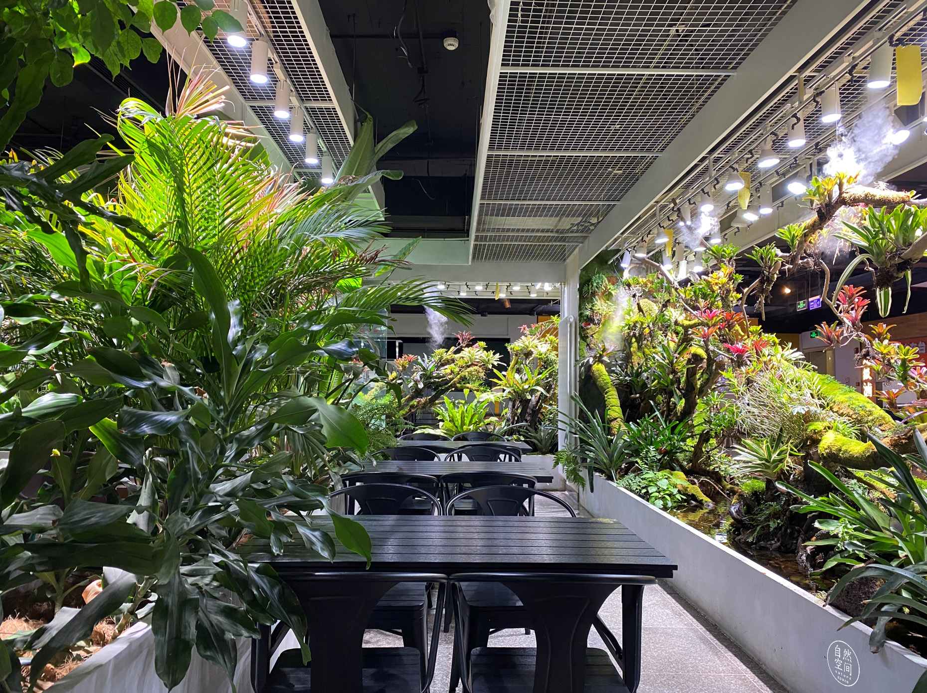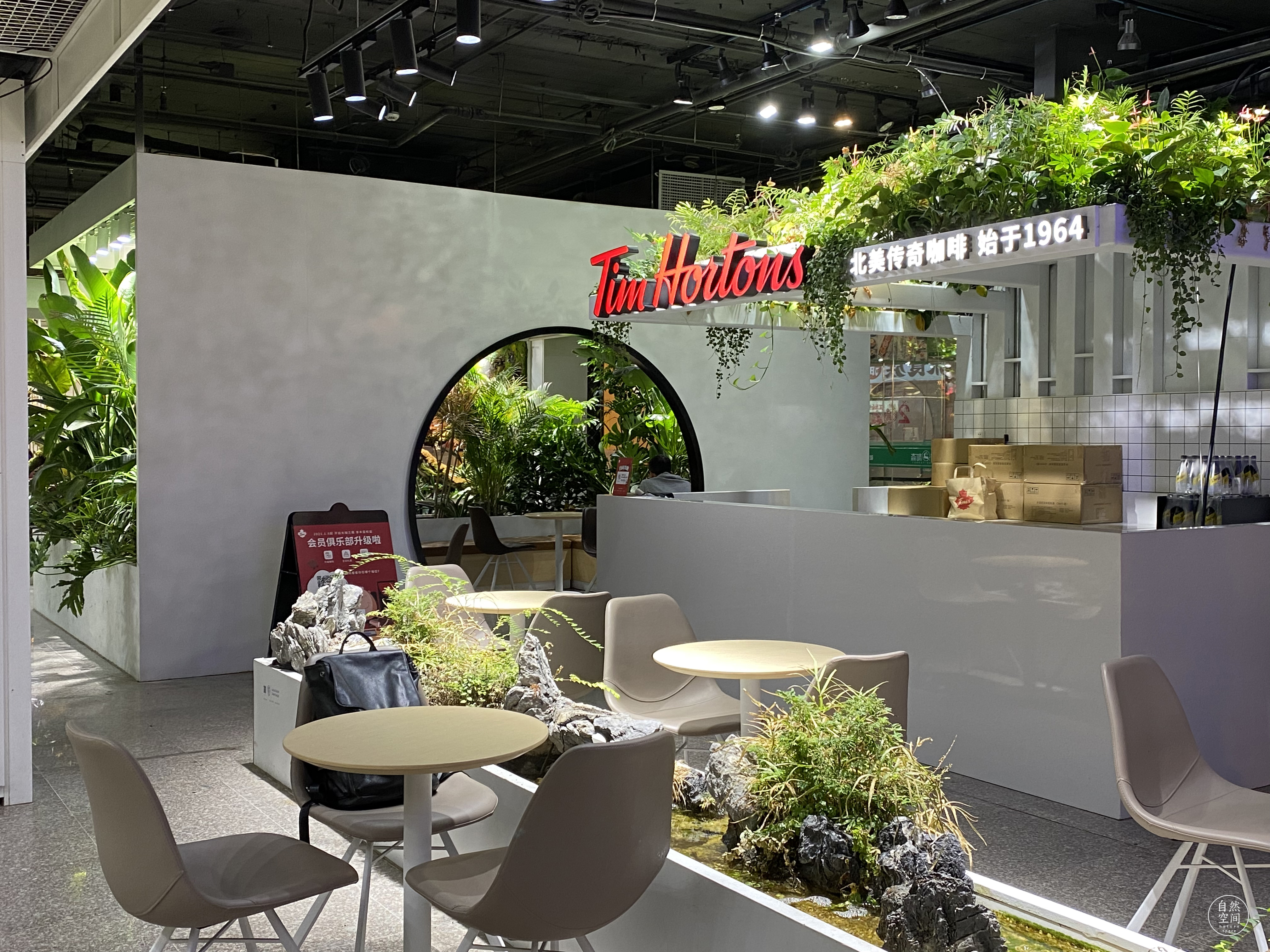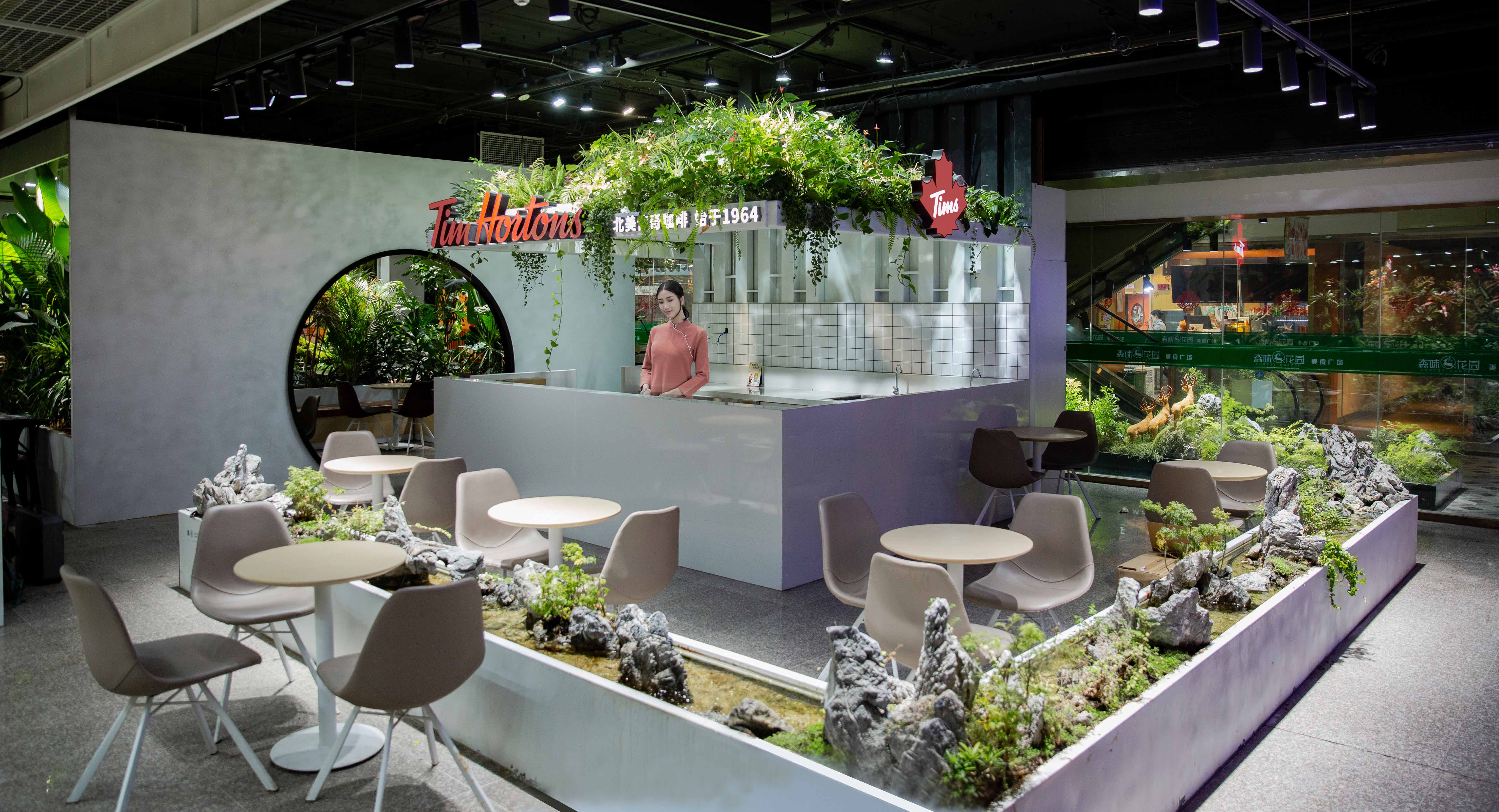 This tims Cafe full of plants is located in the center of an underground catering space. A large number of plant landscapes not only provide a comfortable and relaxed green space for the guests in the store, but also serve as the landscape core of the whole underground catering space, radiating and infiltrating to the surrounding, benefiting the whole area.