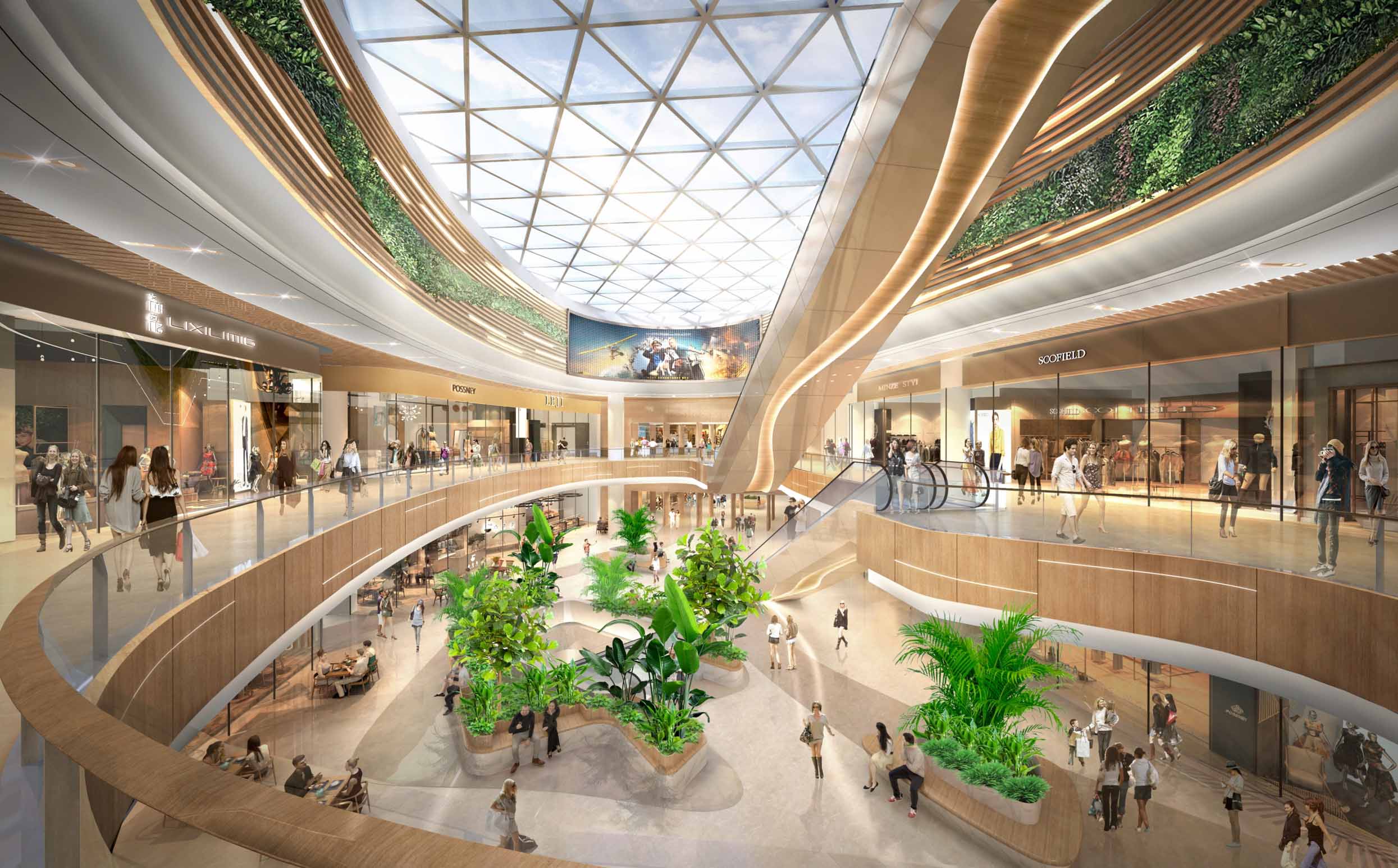 商业空间通过景观绿化以及景观小品的合理搭配,柔化室内冰冷、生硬的线条;祛除枯燥、乏味的购物场景,构成一个完全有机的内循环神态系统。最终目的是提升使消费者的购物体验感。
