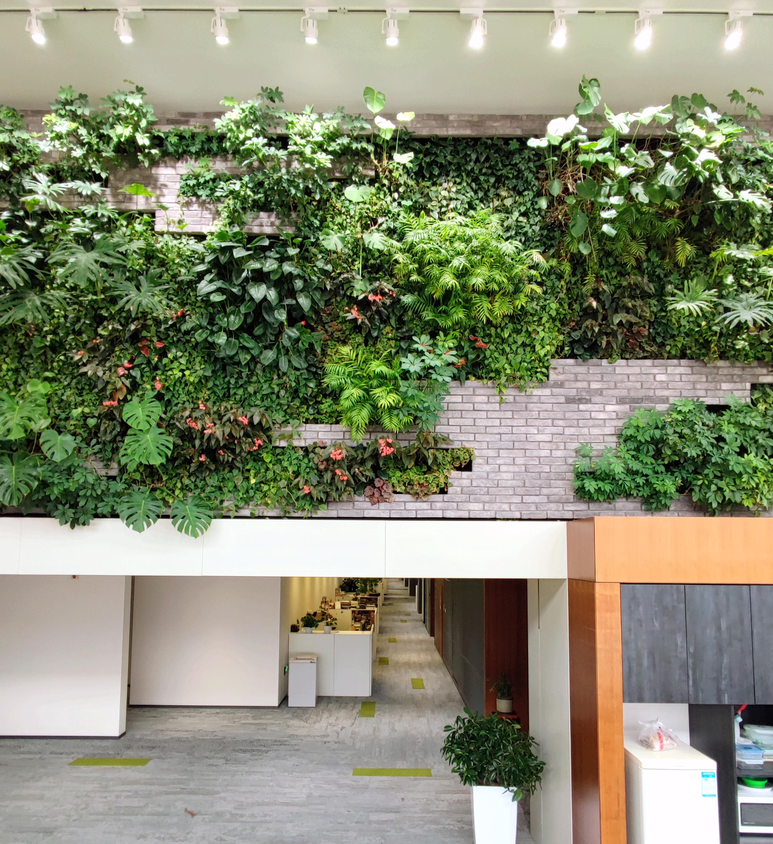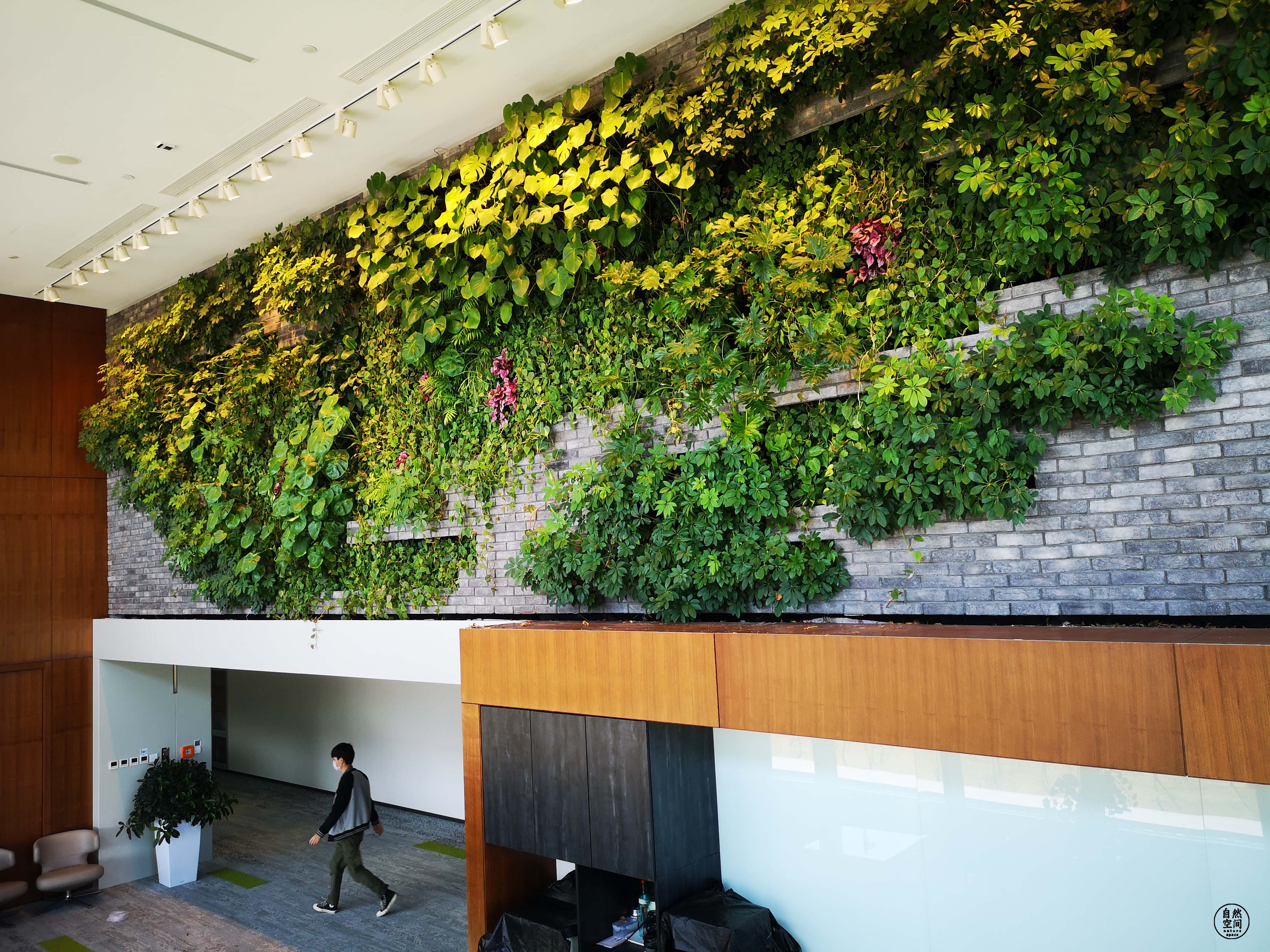 联想全球总部植物墙,选用了灰砖作为饰面搭配参差不齐的直线造型,体现了老北京的文化元素与现代科技的融合。