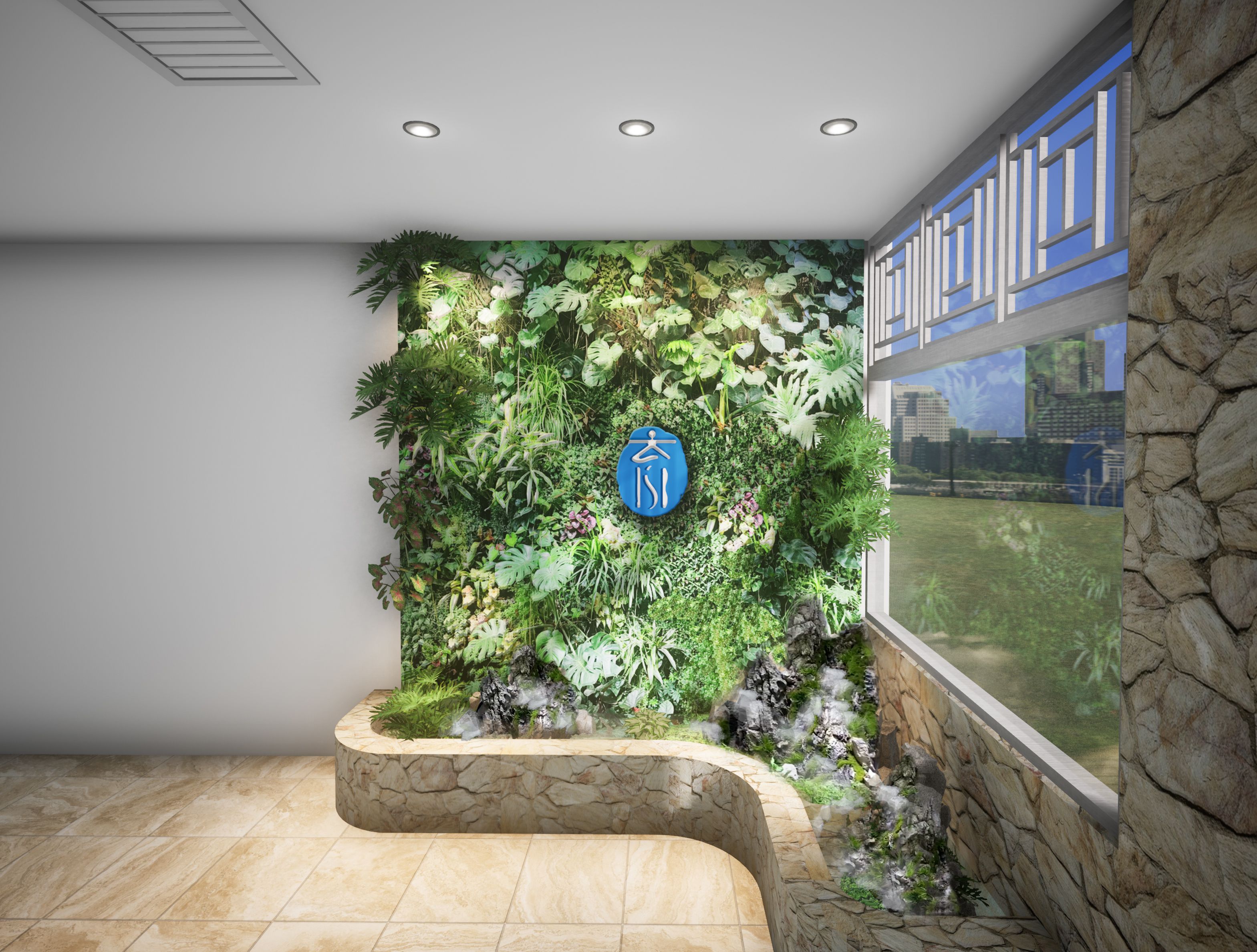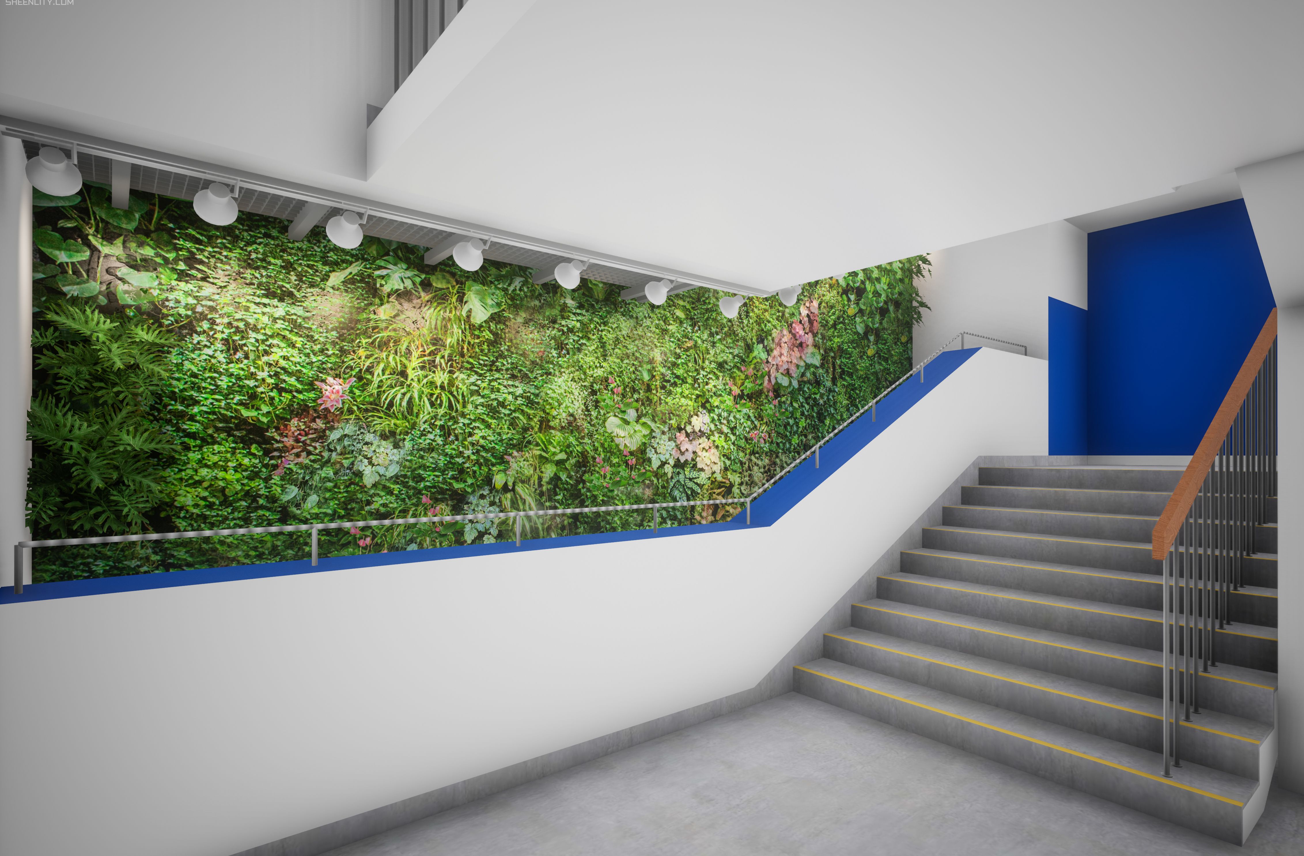 The entrance area connects the green wall with the land and water landscape, creating a natural aesthetic.- 一层楼梯间效果图
