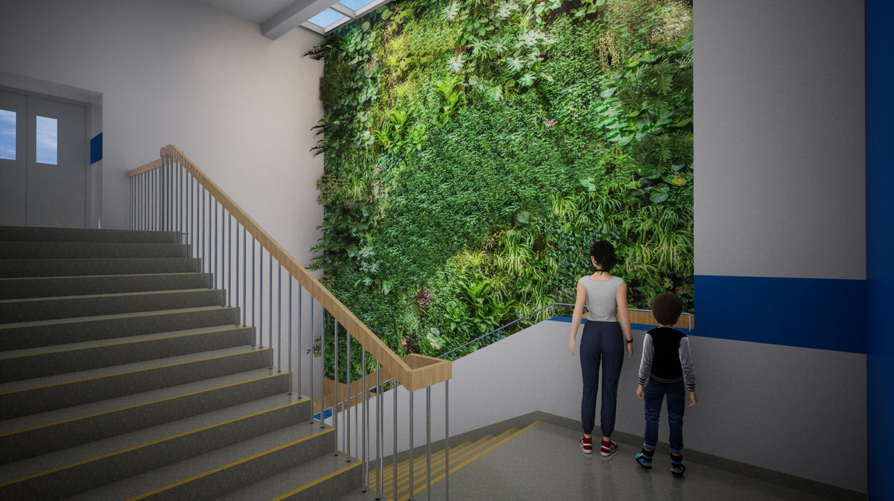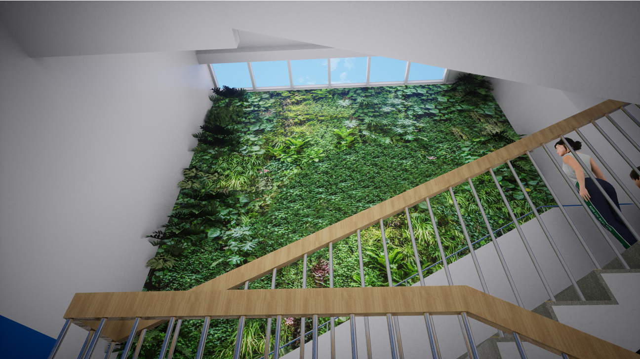 在设计前l楼梯走廊空间生硬而单调,洁白的墙面上给人的感觉缺少一丝生机与活力。将楼梯走廊空间引入自然绿肺的概念,
